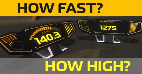Ein Bild vom Geschwindigkeits- und vom Höhenmesser. Die Geschwindigkeit und die Höhe werden im HUD angezeigt Der Höhenmesser ist ein Block der Kategorie Dekoratives, der die aktuelle Höhe des Roboters im HUD und direkt auf dem Block anzeigt. | ||||||||||