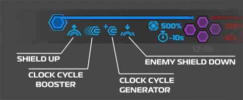 Capturing and holding two fusion towers enables the Clock Cycle Booster for members of the capturing team, which provides both a passive and active overclocking bonus. The passive bonus gives each player in the capturing team a small amount of clock cycles every second for as long as they are able to hold the two towers. On the other hand, the active bonus applies as a multiplier that increases the amount of clock cycles a player receives for damaging or destroying enemy bots, towers and reactor crystals.