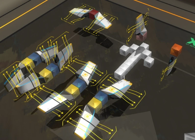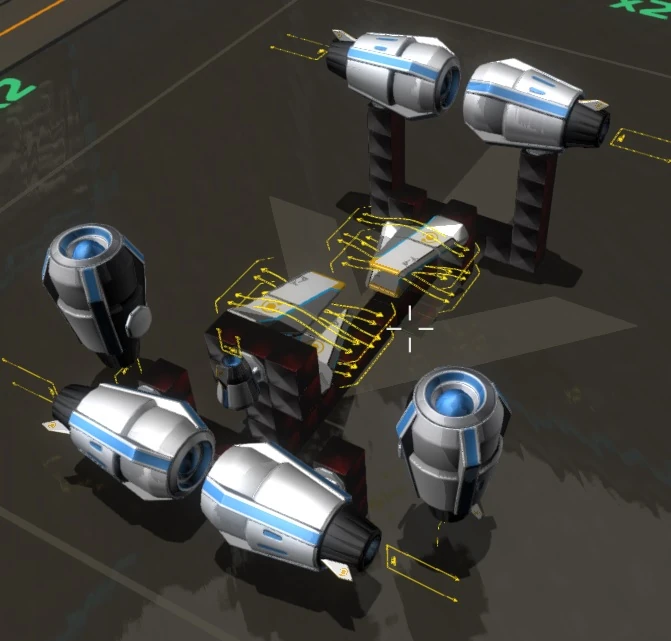 - When building the actual craft, make sure to connect parts to the chassis individually so they are not lost in pairs (see triforcing for help on how to do that). Especially similar thrusters should be mounted separately so you don't lose crucial components in clusters. Losing too many thrusters on one side of your thruster stick can really damage your overall control and maneuverability.